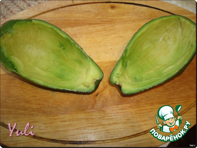 Один плод авокадо (второй мы будем использовать для украшения) разрезать пополам, удалить косточку.