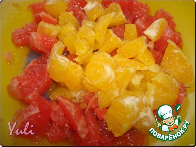 Мякоть половины грейпфрута и половины апельсина отделить от пленок и нарезать кубиками.