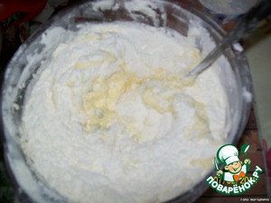 Всыпать муку, перемешать до однородного состояния. Добавить остальные белки и осторожно вымесить тесто.