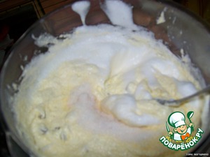 Положить в растертую массу половину взбитых в крепкую пену белков и изюм.