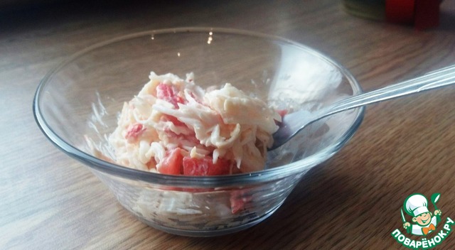 Выкладывать слоями: помидоры, крабовое мясо, майонез,