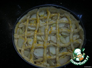 Из оставшегося теста сделать жгутики и в виде сетки покрыть яблоки. Смазать желтком.