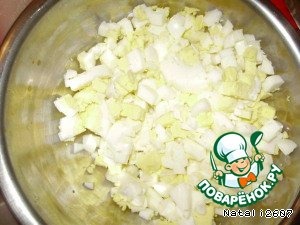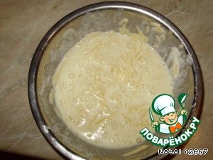 Сыр натереть на терке, добавить яйцо (1 шт.) и майонез, тщательно взбить.