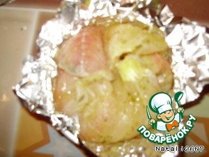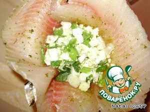 В кокотницу (или в небольшие формочки) кладем кусочек фольги, сверху филе рыбки, вовнутрь пару ложек начинки, маленький кусочек масла сливочного.