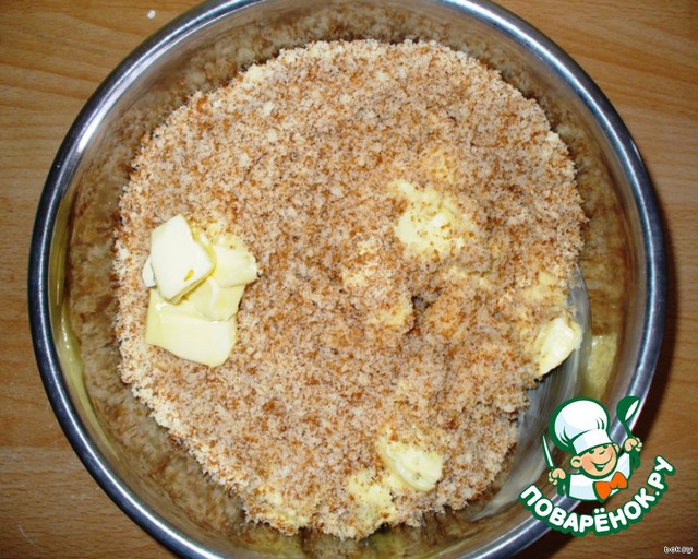 • Бисквитные коржи раскрошить (я - при помощи блендера) и перемешать их со сливочным маслом.