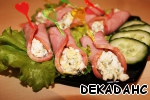Подготовленную начинку выложить на тонкие ломтики ветчины или карбоната и закрутить рулетиками, после чего сколоть шпажками.