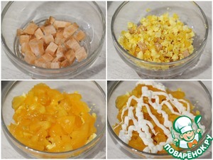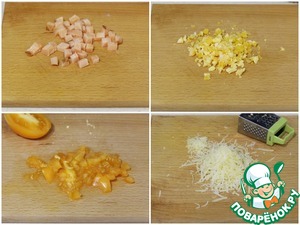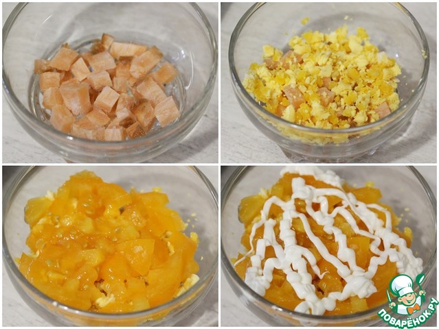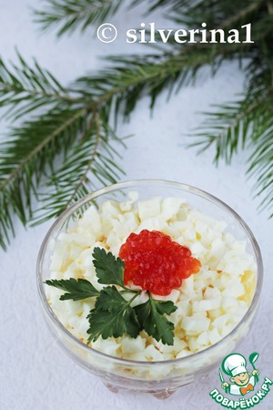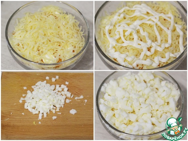 Верхним слоем выложить белки, натертые на крупной терке или нарезанные на мелкие кубики.