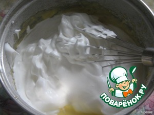 Белки взбить с оставшимся сахаром и осторожно вмешать в тесто