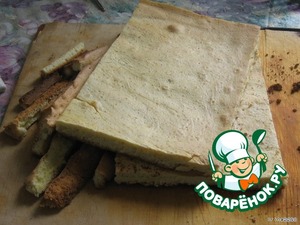 Готовый бисквит нарезать на произвольное количество частей (я немного передержала его в духовке, т. к. дочка мешала постоянно)