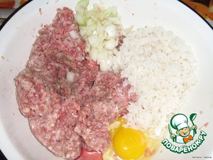 Кладем в фарш яйцо (сырое), рис, лук (мелко нарезанный), соль, перец по вкусу -
