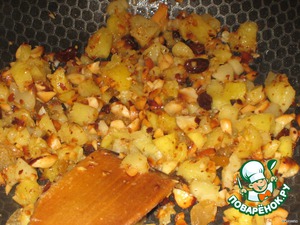 Добавить к орехам изюм, ананас, мед, соль, все хорошо перемешать, прогреть 2-3 минуты.