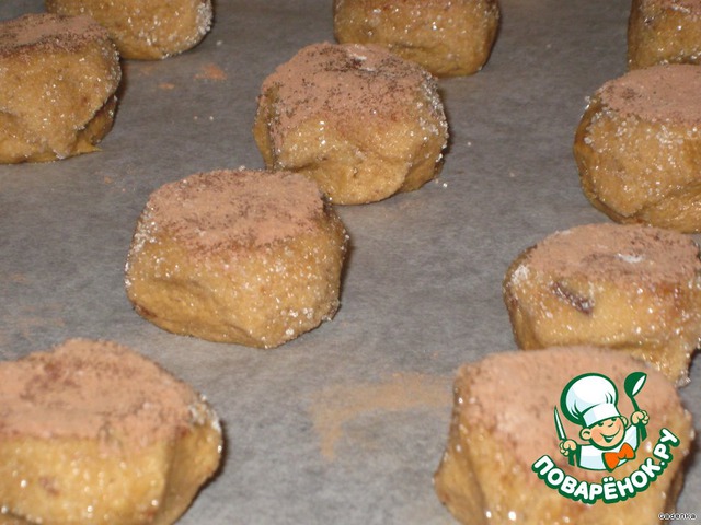 Влажными руками сформировать небольшой шарик, 2,5-3 см в диаметре, обвалять в сахаре, затем одной стороной обмакнуть в какао.