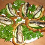 На хлеб намазать немного чеснока, затем положить огурец, а сверху шпроты.