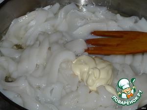 Кальмары разморозить, порезать полосками, обжарить с майонезом (минуты 3! :))