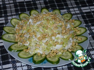 Выложить на блюдо, украсить огурчиками, посыпать орешками. Готово!