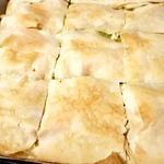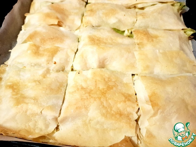 Затем укладываем на начинку остальные слои теста, так же каждый промазываем и надрезаем ножом на куски, чтобы потом легче было резать порции, так как тесто получается хрустящее