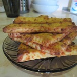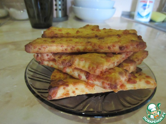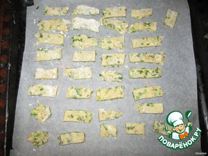 По истечении времени раскатываем тесто не очень толсто, разрезаем на полоски, выкладываем на противень, смазанный маслом либо застеленный бумагой