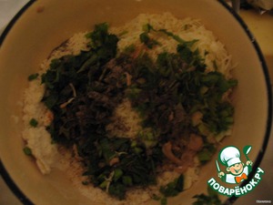 Добавляем соль, тертый сыр (сыра я брала больше 50 граммов, т. к. мы очень любим сыр), рубленую петрушку и лук, 1/2 чайной ложки горчицы. Красный перец, черный перец и соль добавляем по вкусу