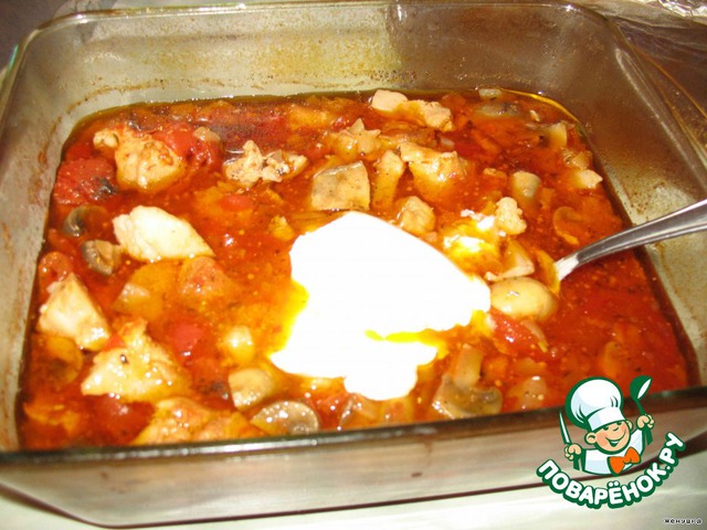 обжаренный ранее лук кладем на дно формы для запекания, сверху укладываем обжаренное мясо и шампиньоны.