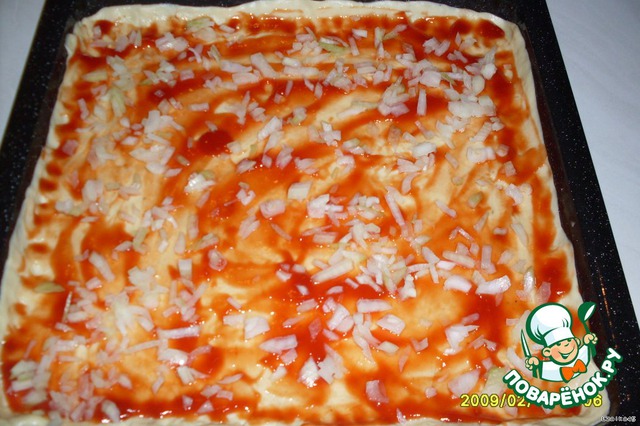 тесто (у меня из хлебопечки), а вы делайте по любимому рецепту, раскатать по противню, смазать кетчупом и посыпать мелко порезанным луком