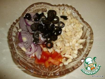 Сложить в салатник помидор, лук, кальмар и маслинки и посолить по вкусу.