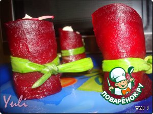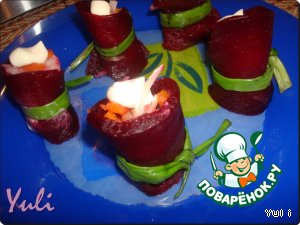 Свернуть свеклу рулетиком и перевязать перышком зеленого лука.