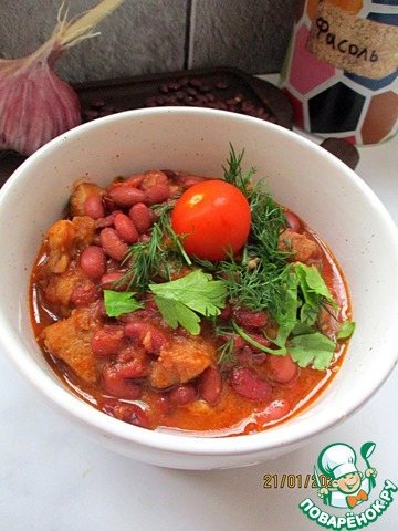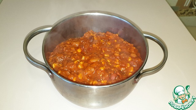 Добавить фасоль, чеснок, соус чили и томат-пасту, разведенную в 1-1,5 стаканах воды, к мясу. Перемешать, убавить огонь, накрыть крышкой, и тушить около 45-55 минут.