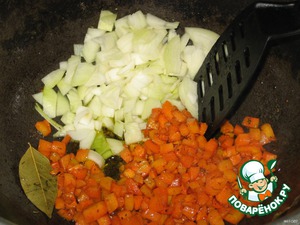 Заливаем бульоном (у меня мясной), чтобы покрывал на 3-4 см.