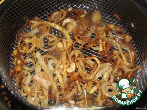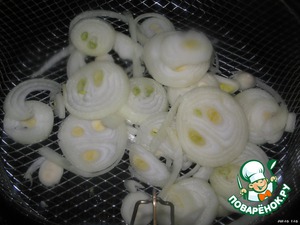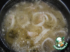 Репчатый лук нарезать кольцами (не очень тонко, приблизительно пара миллиметров). И обжарить в раскалённом масле.