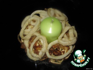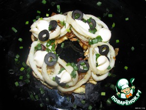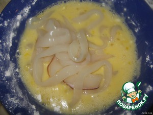 Кальмары, если нужно, очистить, вынуть внутренности (лучше, конечно, купить уже чищеные), нарезать кольцами.