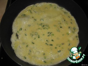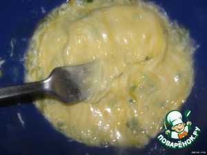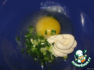 Для яичных блинчиков смешать яйцо (я делала по одному яйцу - каждое по очереди), добавить майонез и мелко нарезанный зелёный лук.