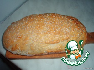 Положить его в смазанную маслом форму для выпечки. И оставить его, чтоб немного подошел. Когда подойдет, побрызгать водой, можно смазать яйцом и выпекать ~40 минут. (Я смазывала яйцом и посыпала кунжутом) -