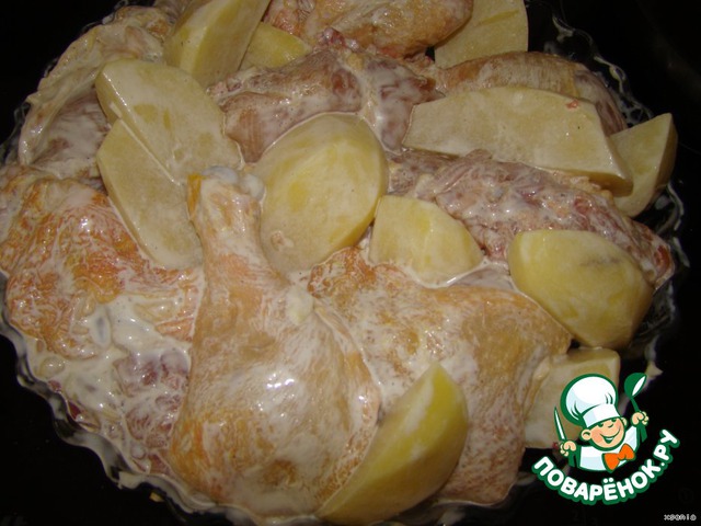 Курицу нарезать на равные части.. Сметану заправьте горчицей... мелко порезанным чесноком... Картофель сырой очистить и нарезать на 4 части... (хоть вдоль... хоть поперек))) В миску складываем картофель и курицу... солим... перчим... добавляем специи по желанию.. лавровый лист... Заливаем сметаной и оставляем минимум на час промариноваться.