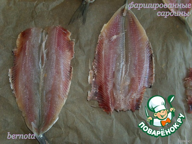 Удаляем хребет, моем, просушиваем салфетками и кладём на противень. -