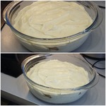 На печенье выложить половину крема, сверху снова печенье, пропитанное кофе, и снова крем.