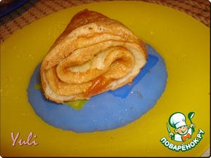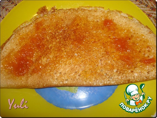 Делаем букет: сворачиваем блин пополам, смазываем его джемом.