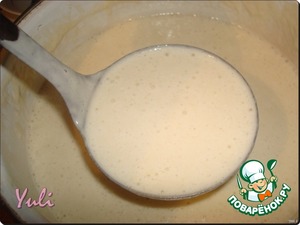 Молоко доводим до кипения и вливаем в тесто. Хорошенько размешиваем.