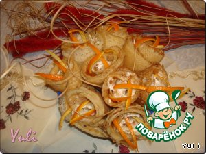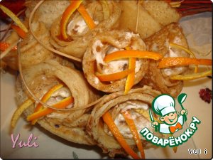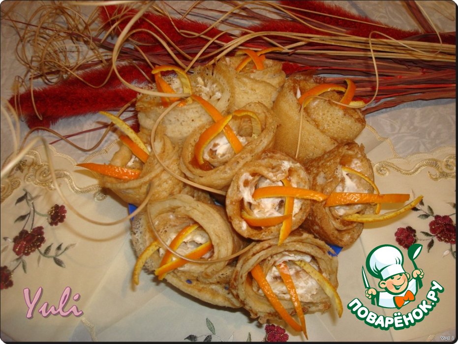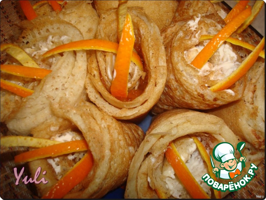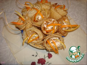 Верх блина можно промазать чуть-чуть сметаной и в каждый из них вставить по 3 апельсиновые полосочки.