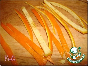 С апельсина аккуратно снимаем цедру, срезаем белые пленки и режем на тонкие длинные полоски.