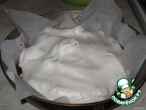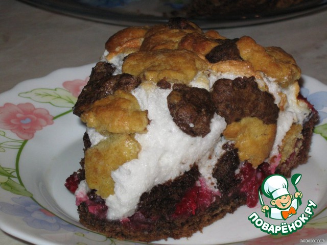 Масло растереть с сахаром. (0, 5 стак. ) Добавить желтки, муку и соду и замесить мягкое тесто. Разделить его на две части. И одну часть разделить еще на две, в одну из которых добавить какао. Т. е. получается один большой белый кусок , один маленький темный и один маленький белый. В оригинале в форму выкладывается большая белая часть, но у меня получилась она с какао. Значения особого это не имеет. На тесто , выложенное в форму высыпаем вишню. Рвем на кусочки часть темного теста и посыпаем вишню. Белки взбиваем с сахаром (1 стак. ) и выкладываем сверху. И наконец рвем на кусочки белое тесто и оставшееся темное и покрываем белки. Ух, все. Выпекаем в духовке минут 30 -35. Пирог очень сильно поднимется.