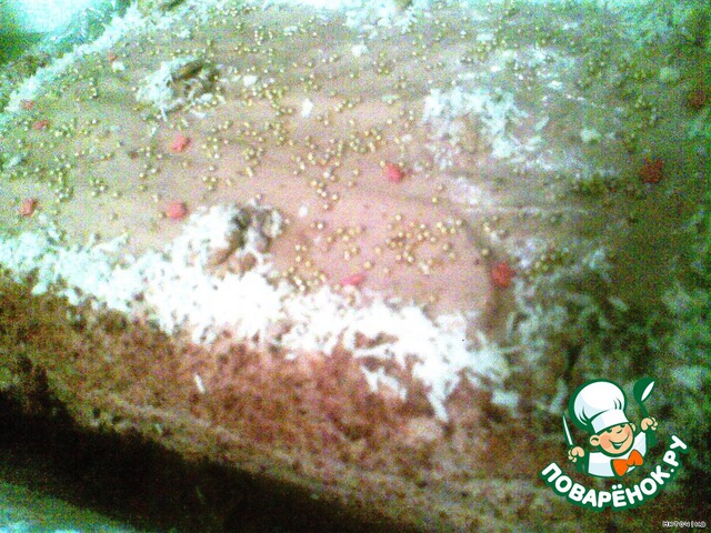 бока обсыпаны крошкой из обрезков, половинка грецкого орешка, чуть кокосовой стружки и всяких бусинок.