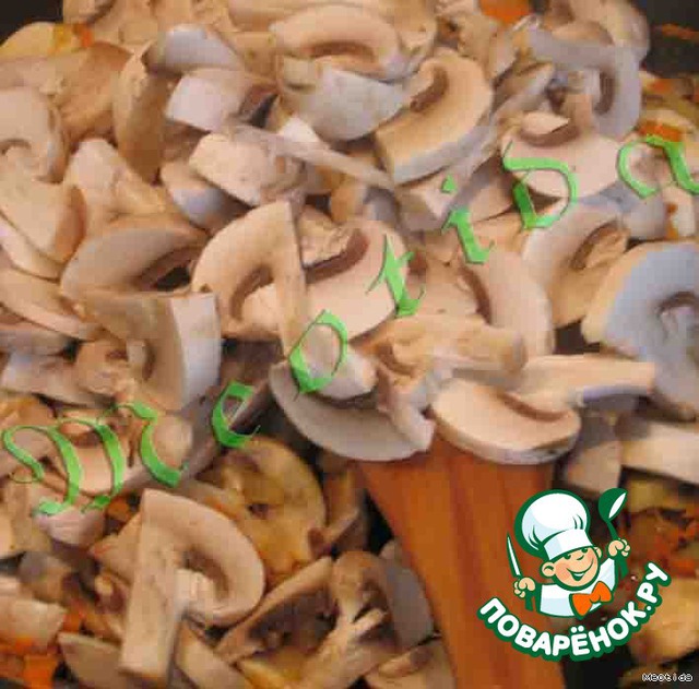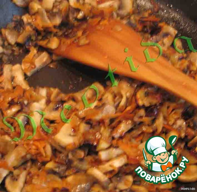 Сверху на язык кладем слой грибочков, посыпаем любимыми специями