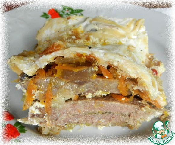 Нарезаем язык ломтиками, выкладываем слоем в блюдо для запекания