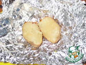 Когда картофель испечется, достать из духовки и разрезать пополам.