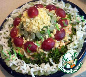 В центр салата высыпаем измельченный желток, украшаем половинками винограда и...