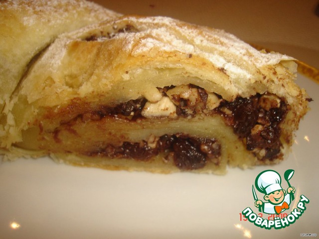 Тесто раскатать на две полосы и выложить на них по всей длине начинку поделив пополам