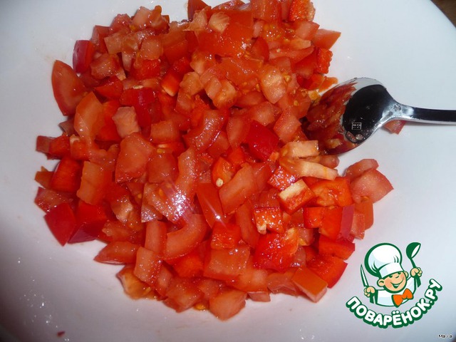 Когда лук станет золотистого цвета, добавляем к нему нарезанную красную паприку и обжариваем еще пару минут.