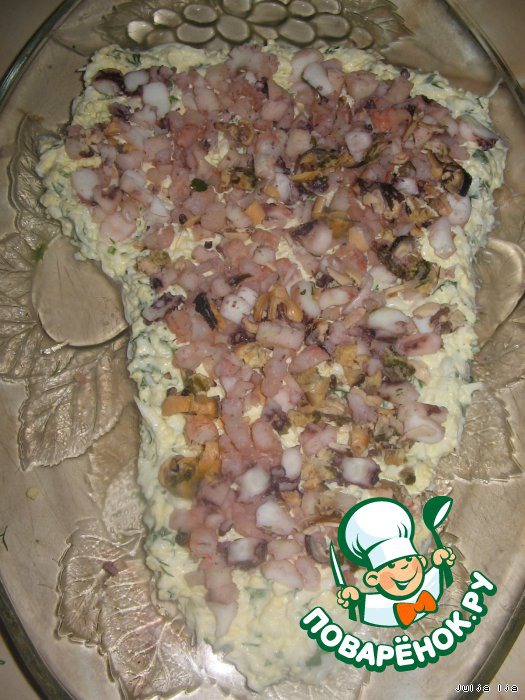 Следующий слой - мелко нарезанные кольца копчёного кальмара (того, что к пиву продаётся, маленькая пачка).