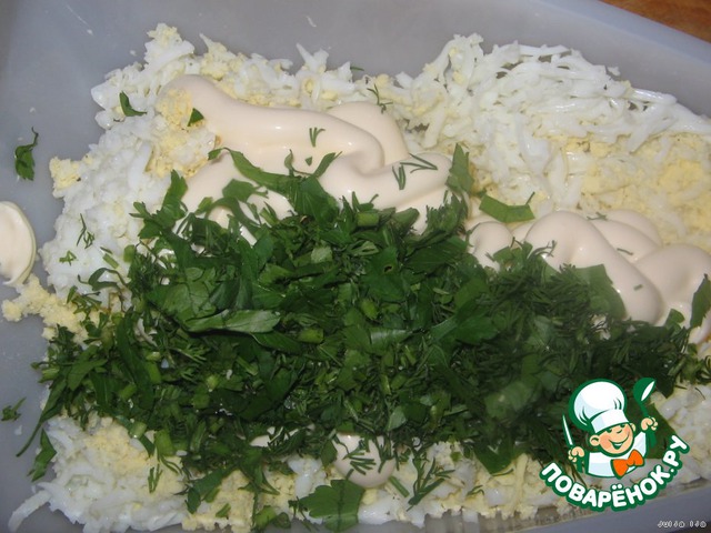 Отваренные яйца натереть на мелкой тёрке, добавить немного нарезанной зелени (у меня петрушка и укроп), посолить и поперчить по вкусу, добавить немного майонеза (чтобы "связать" массу). Перемешать.
