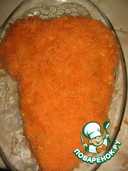 И последний слой - тёртая на мелкой тёрке морковь. Если она даст много сока, его лучше немного отжать. Морковью "укрываем" весь салат.